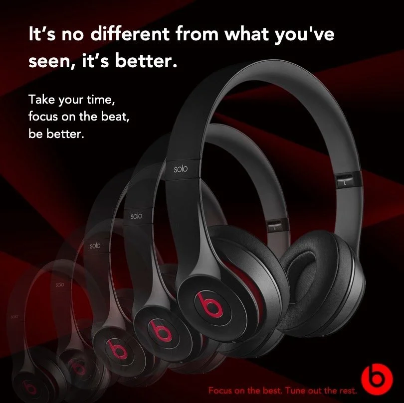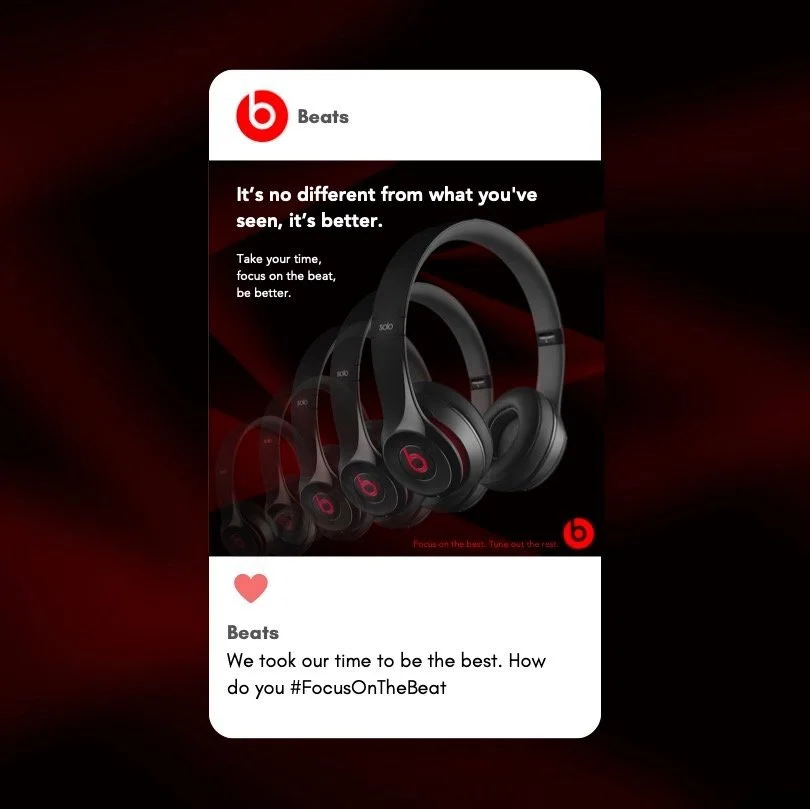 I worked with a copywriter, Lily Smith, in creating visuals to accompany her copy for a Beats campaign. In keeping with the brief I prioritized incorporating the energy Lily embodied with her copy and the bold, contrasting visual identity of Beats. The copy itself plays on the history of Beats breaking into the wireless headphones game. They may not be the first, but they are the best. The result is a campaign that embodies the power, strength, and determination of Beats through visual design and copy.